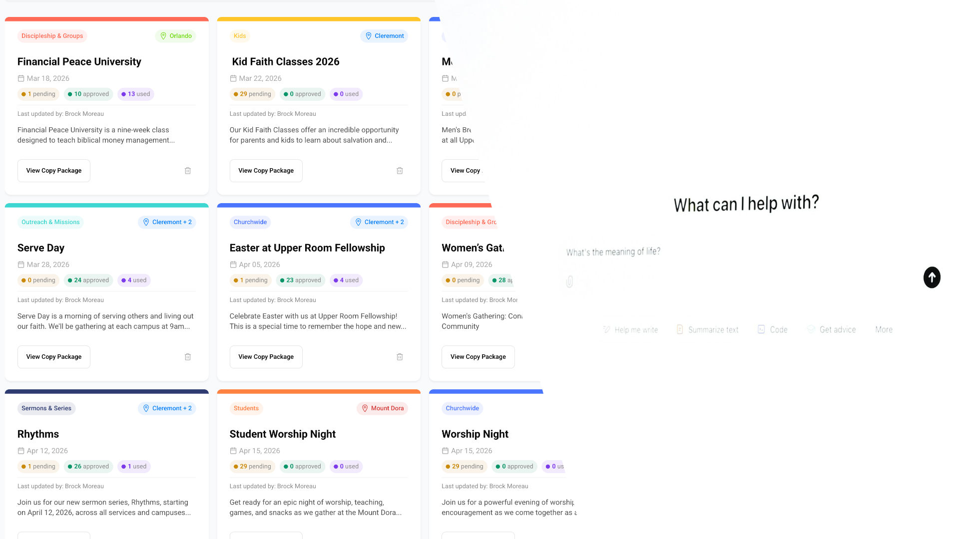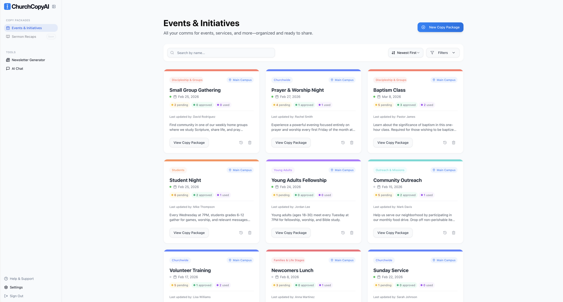 Each Copy Package is organized in one place so your team can review, edit, approve, and share content quickly. Instead of writing everything from scratch each week, you describe what’s coming up, and ChurchCopy.ai delivers all the communication pieces you need in your church’s voice.